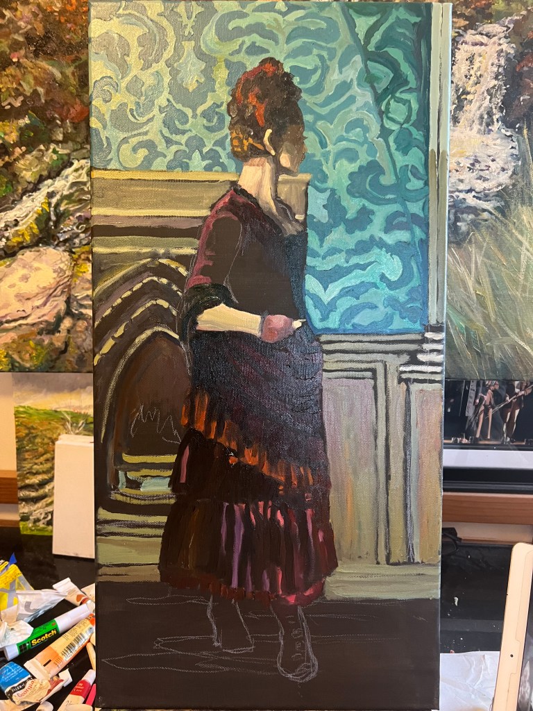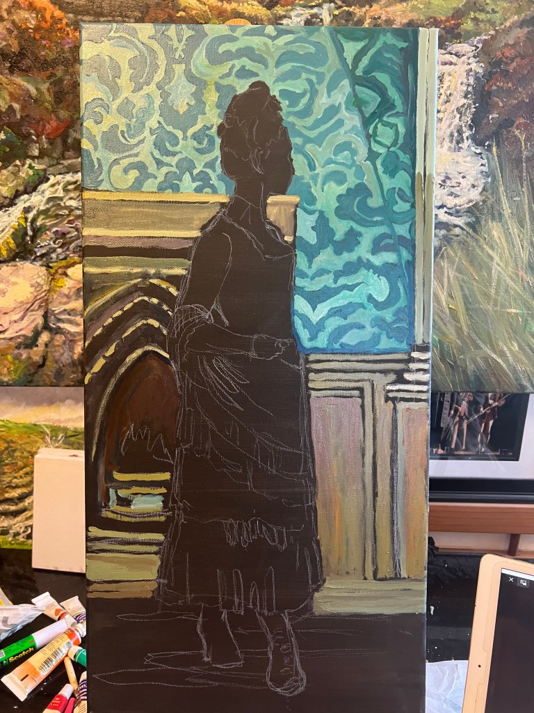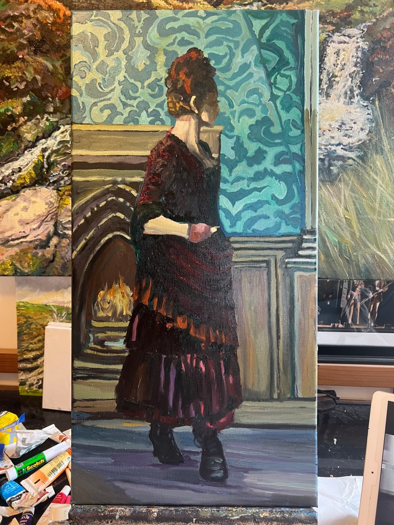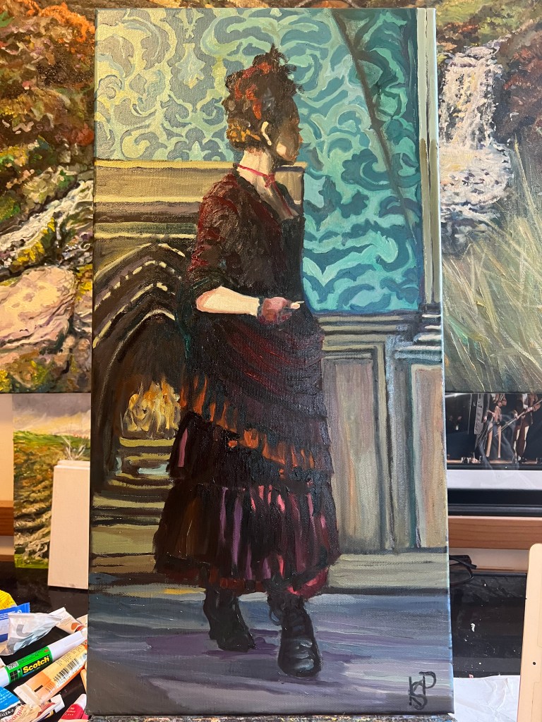 The energy that pours from the painting – she is so full of life and colour. I’ve loved her from the moment I saw her. To me. she is beauty, movement and magic. I just love her! Every time I look at her I smile. I am so delighted to have her in my home.