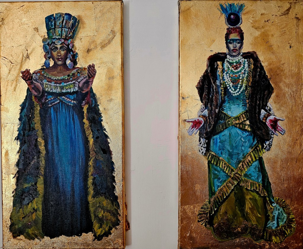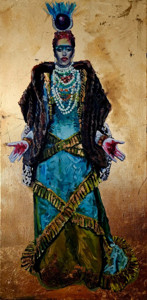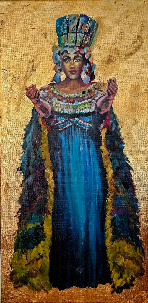 Jnai Bridges as Nefertiti in Akhenaten, Metropolitan Opera New York. Oil on canvas & gold leaf. 30cm x 61cm. £600